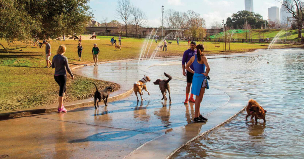 Once you’ve refueled, you may be ready to see some of the local sites. Hermann Park is a great pet-friendly place to visit. Located in Houston’s Museum District, you and your pup will see lots of cool statues and structures throughout the park. For the pup (and parents) who were hoping to check out some of the local wildlife, the resident Muscovy ducks are giant and look pre-historic!