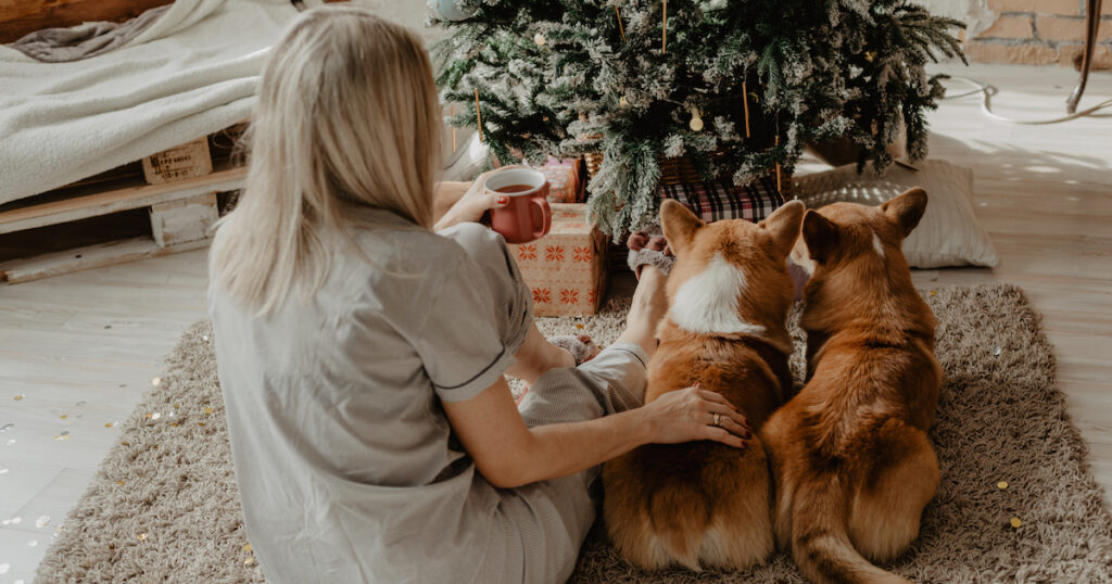 If your pup gets into everything and you don’t feel comfortable having them around a tree or other holiday decor, consider making your space feel more festive using toys and blankets designed for dogs! A snowflake bed with a pillow and blanket is the perfect set this time of year. For a larger pup, this Christmas tree lounger will make any space feel more festive. If your dog sleeps in your bed, there are many brands that offer holiday-themed sheets and blankets.
