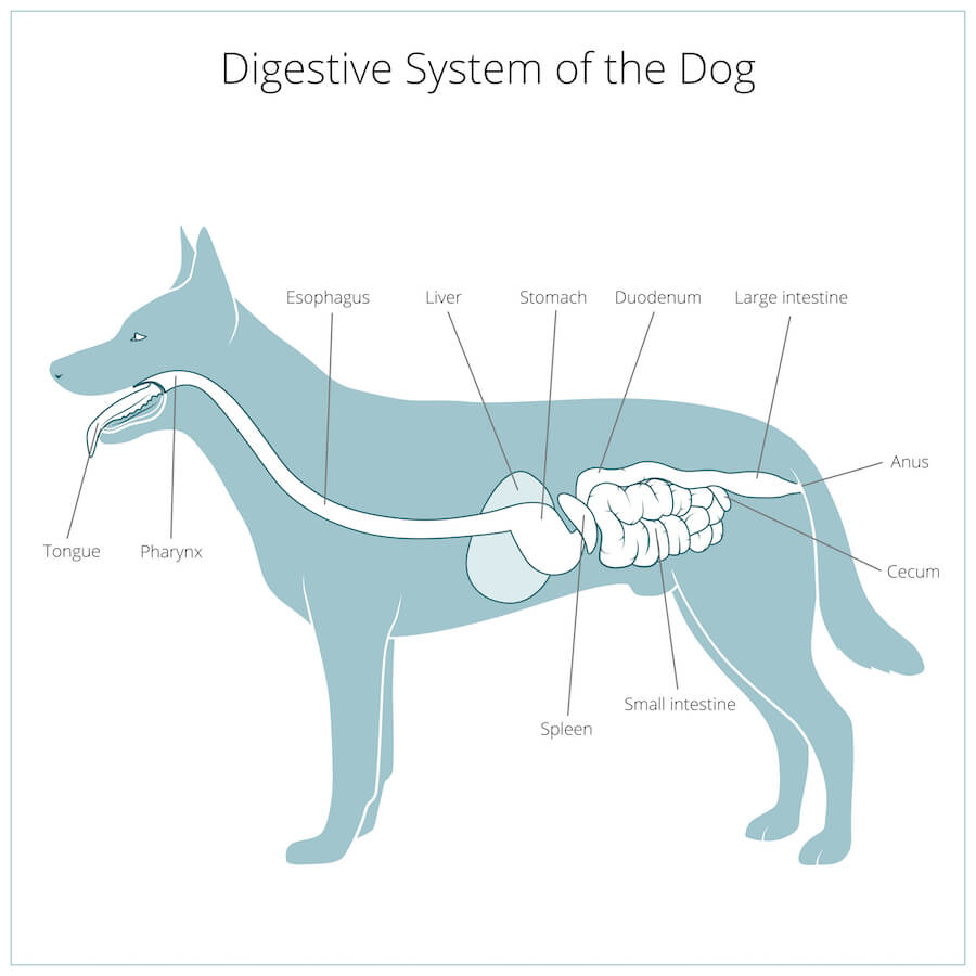 Once your dog’s meal arrives in their stomach, the digestive process really gets churning! The stomach is primed with extremely acidic fluid and powerful enzymes that aggressively break down food into chyme, a semiliquid substance.