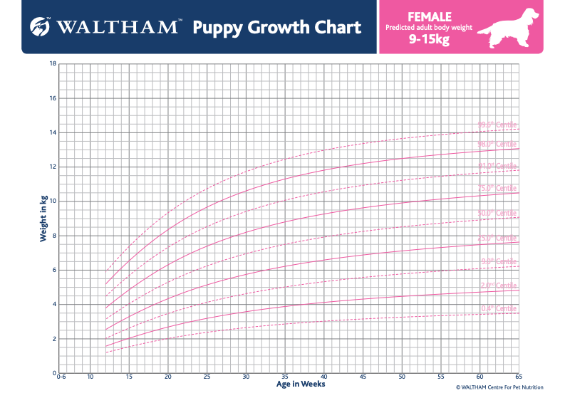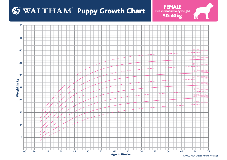 We recommend using the Waltham Growth Chart as a tool to estimate your pup’s adult weight based on their breed and current size. You can select a pre-made chart based on their weight, or use their tool to input data as your pup grows. Here are two examples: