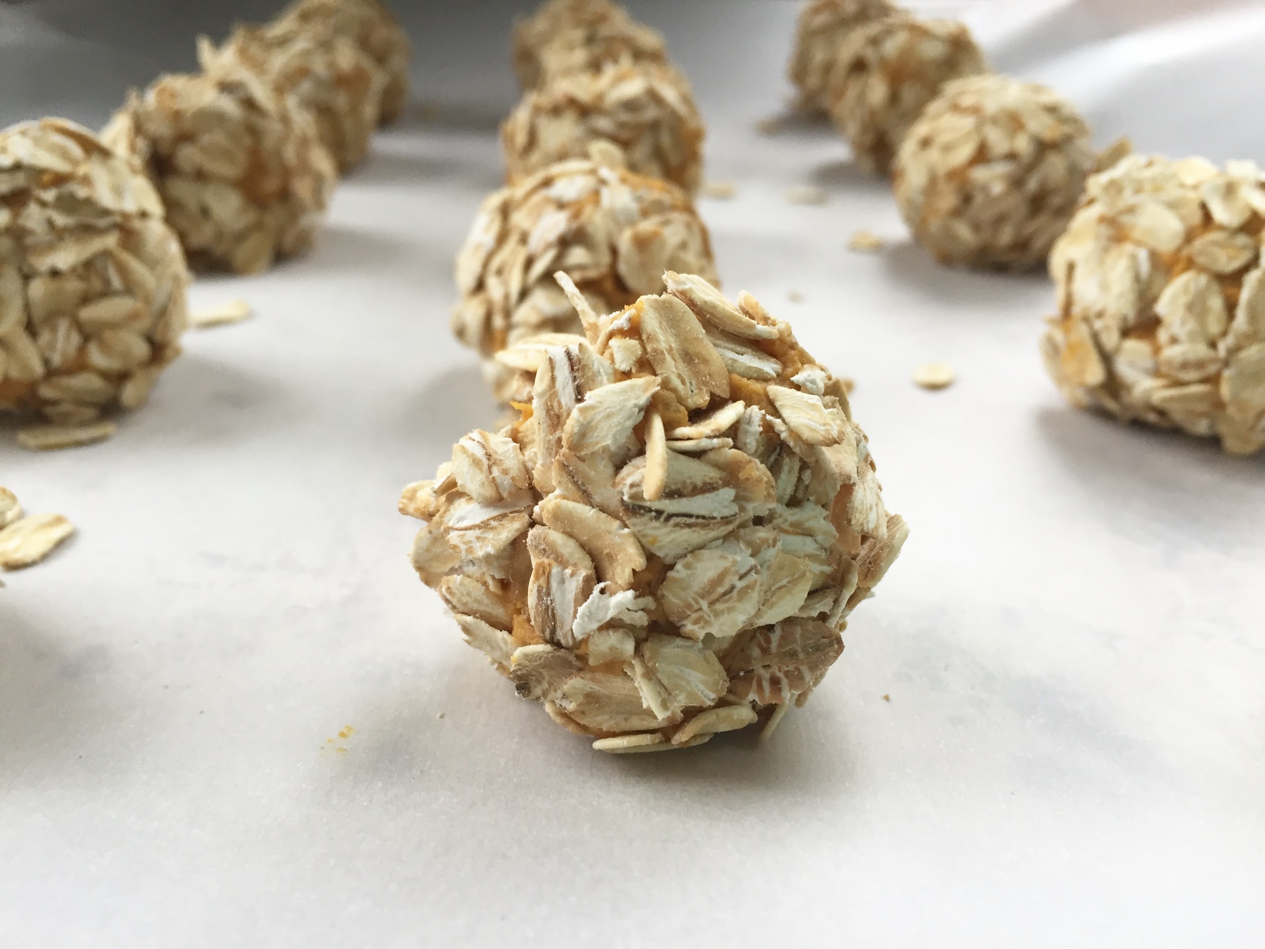 Combine pumpkin puree and chia seeds in a mixing bowl, then stir in peanut butter and mix well. Place rolled oats in a bowl. Use a cookie scoop to drop rounded tablespoons of mixture into the oats, then roll to coat evenly. Transfer each rolled ball onto a baking sheet with parchment paper and repeat. Makes about 20-24 balls depending on size. Transfer baking sheet to the fridge and chill until firm, about an hour.